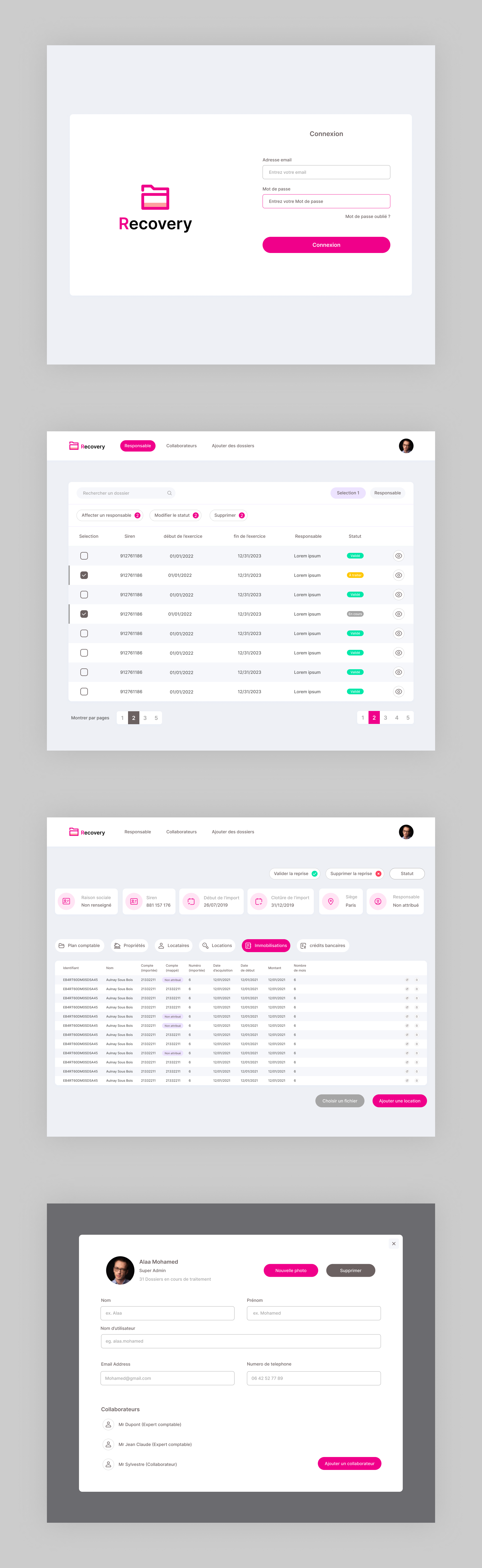 Voici le design que j’ai produit pour Recovery, c’est un outil de gestion qui simplifie certaines taches pour les comptables