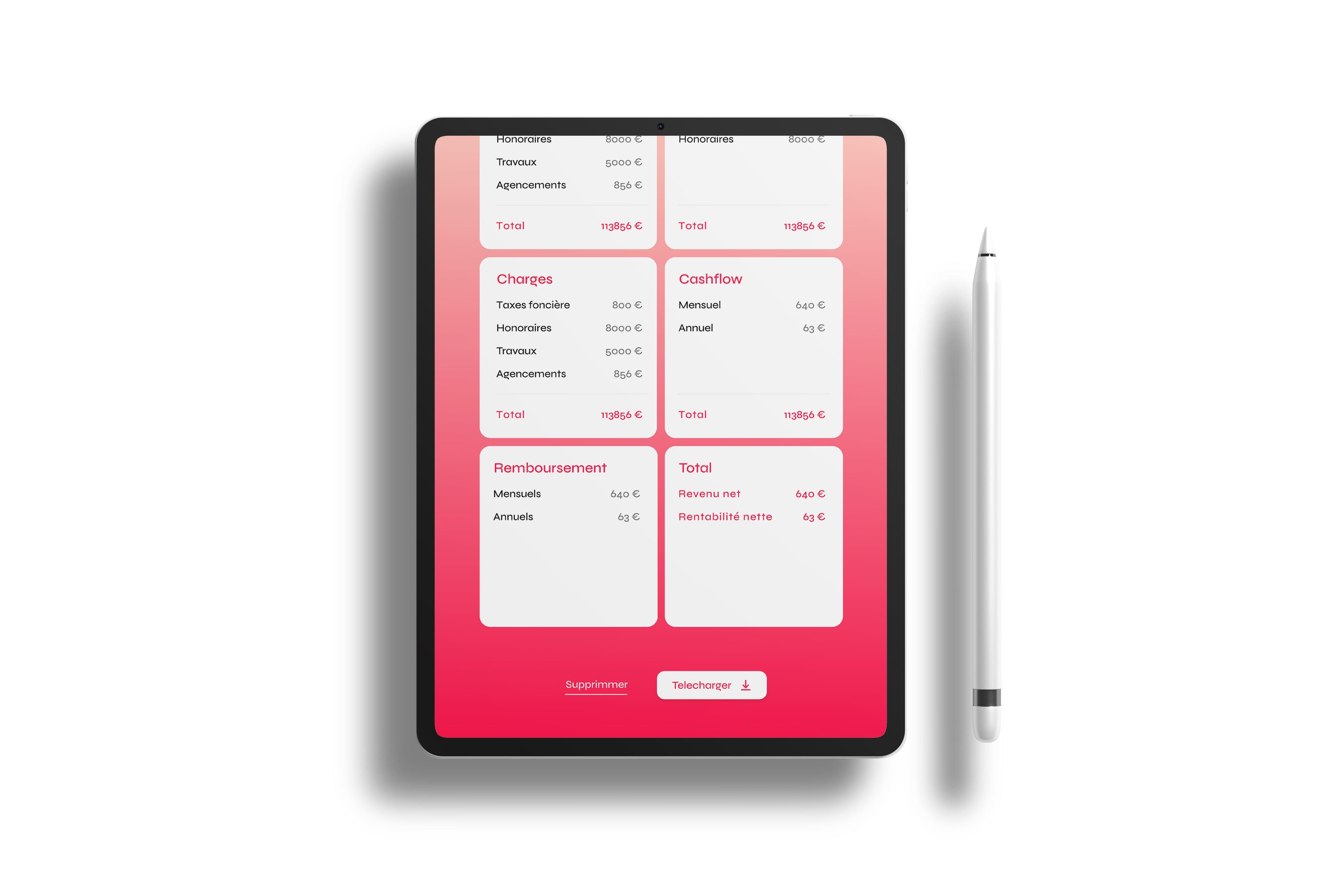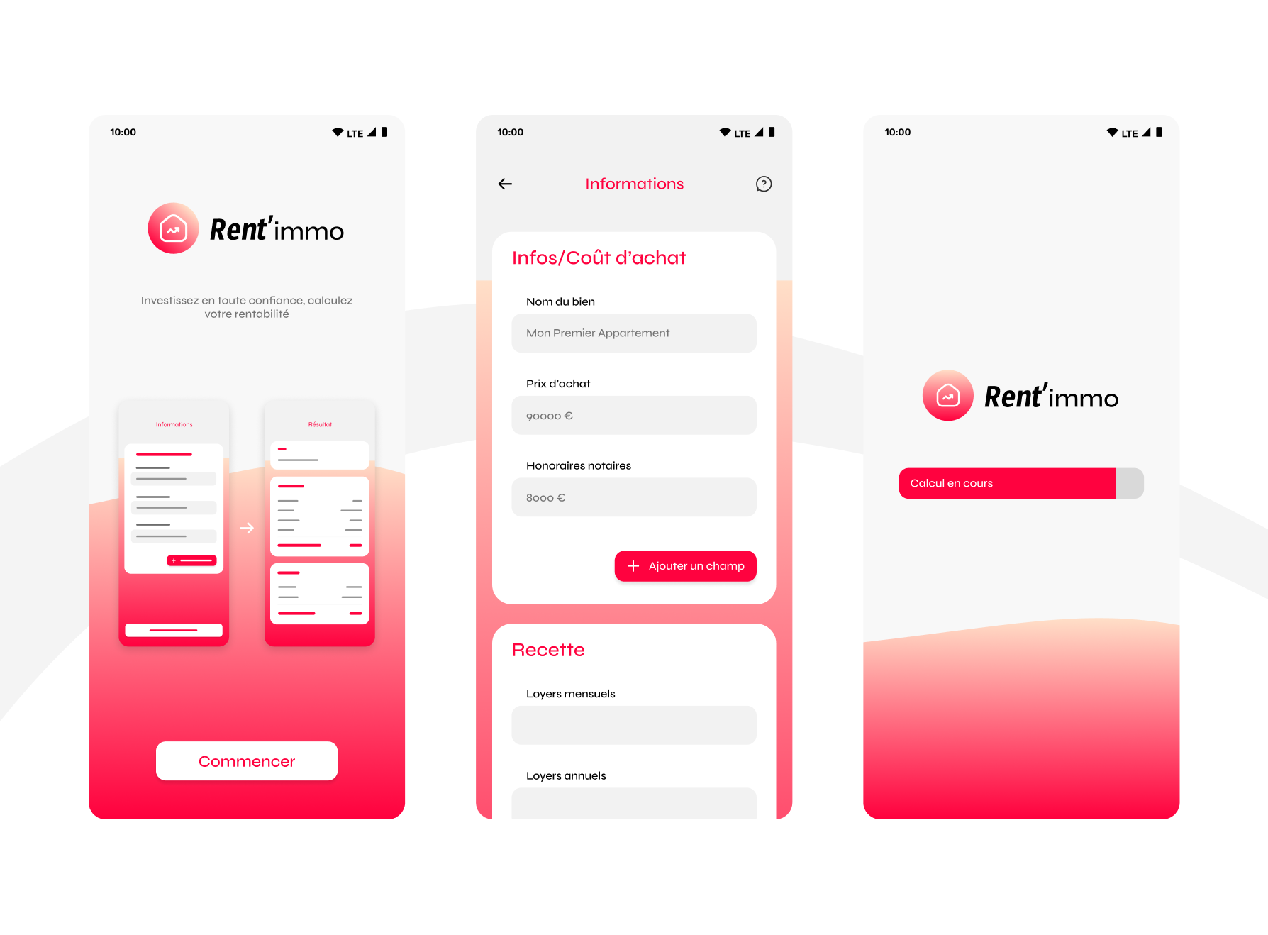 J’ai également travaillé sur le design de l’application Rent’Immo. Cette application offre aux utilisateurs la possibilité d’évaluer la rentabilité de leurs investissements immobiliers en quelques secondes, directement depuis leur appareil mobile.